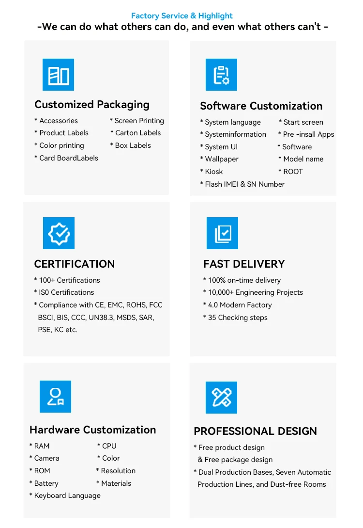 1.Hardware Customised(RAM, ROM, CPU,Resolution,Camera,Battery,Color,Keyboard Language,even Materials)