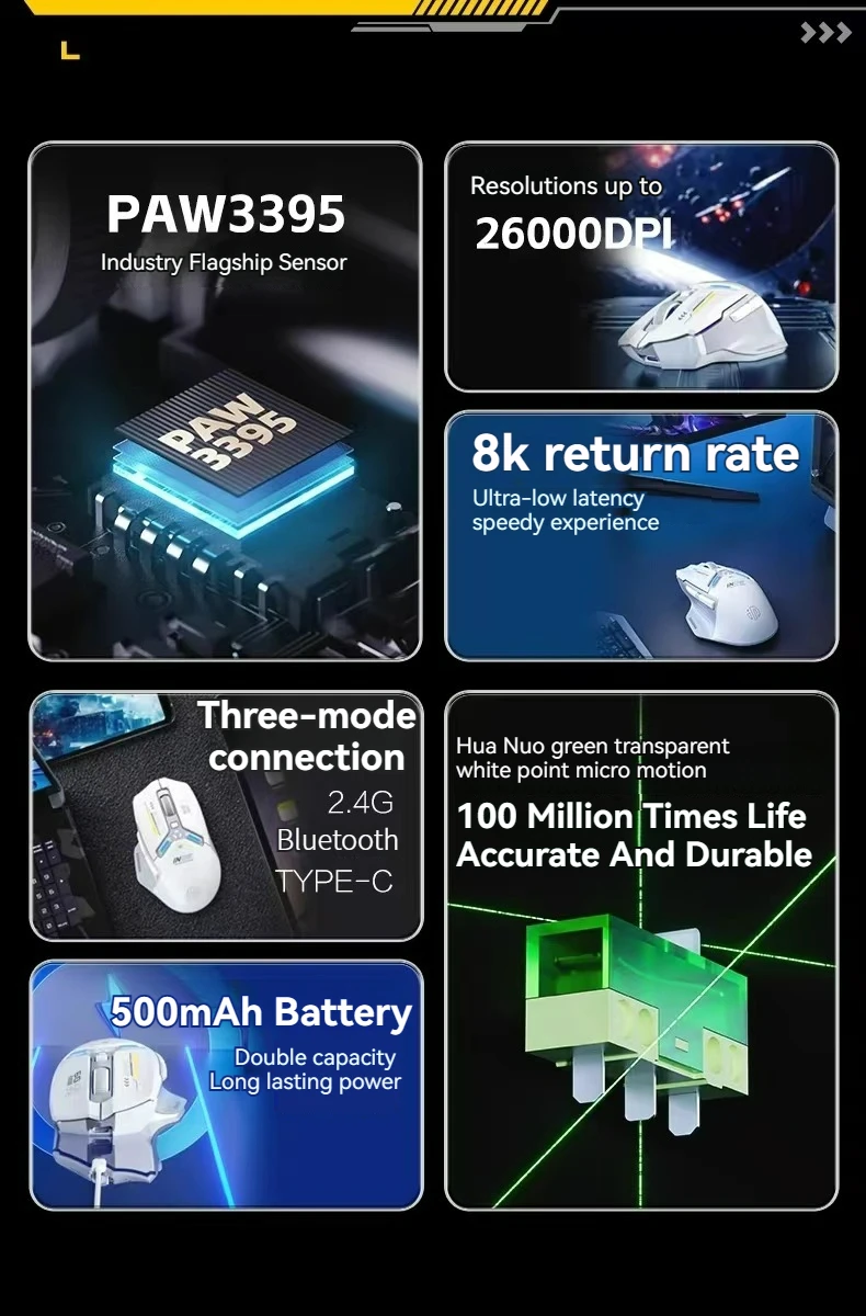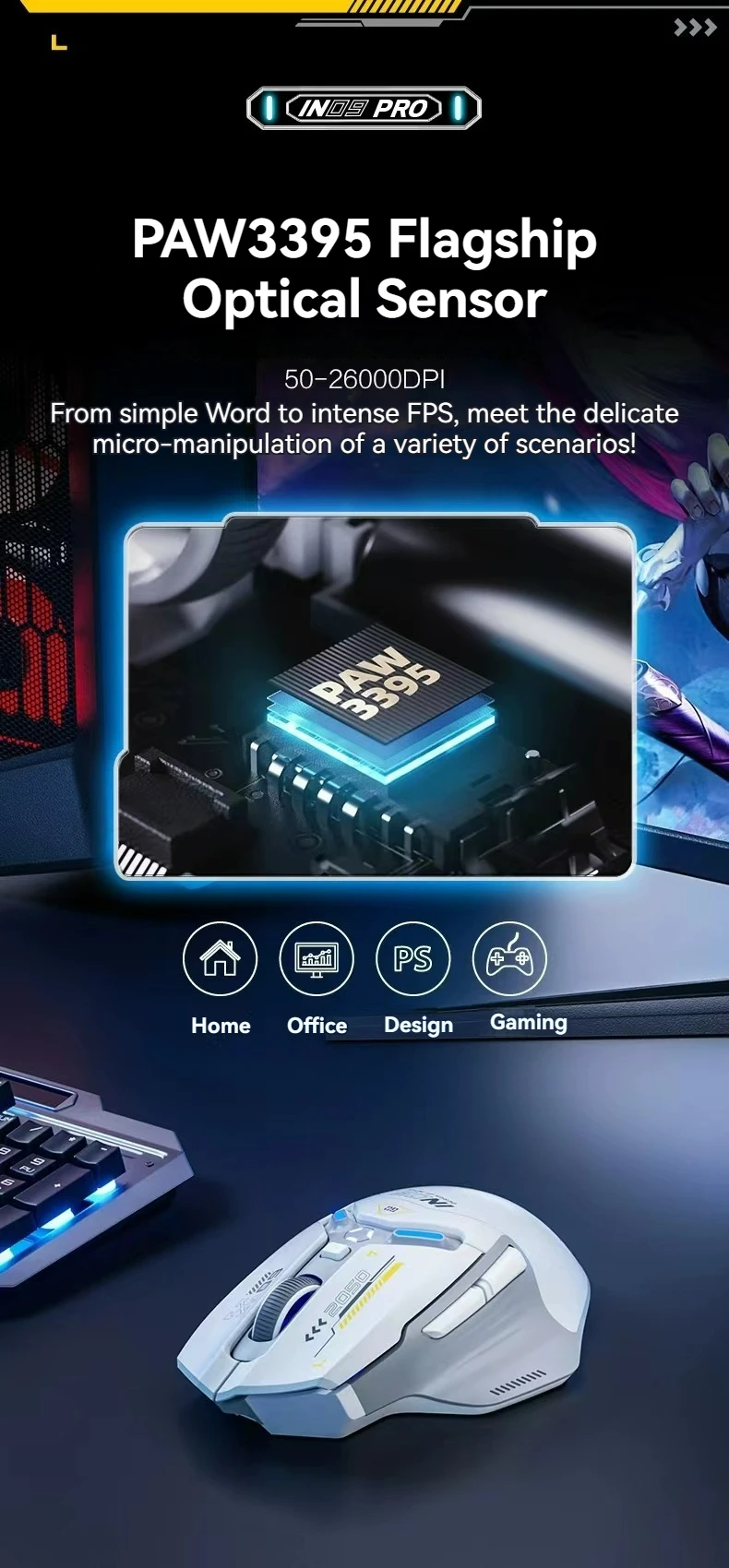 Sensor model: Pixart 3395 (26000 DPI|650 IPS|50G)